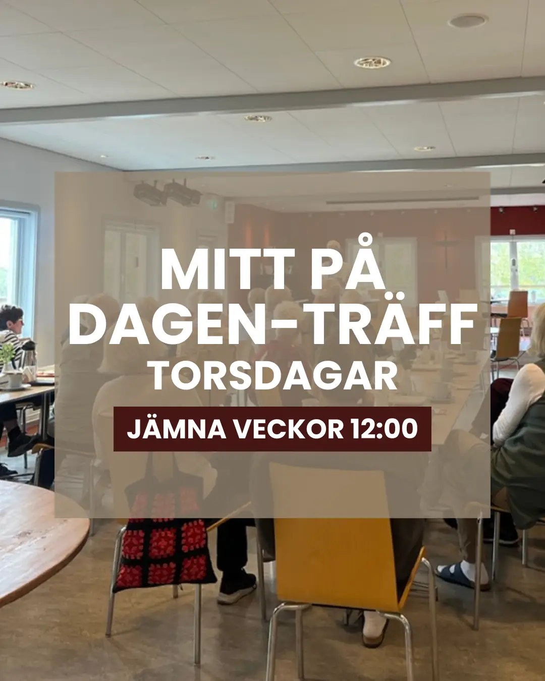 Till mittpådagträffarna är du välkommen för en stunds otvungen gemenskap. Vi fikar tillsammans och får lyssna till en gäst som spelar och sjunger eller berättar kring något ämne. Vi ses ungefär varannan torsdag. Se kalendern för aktuellt program.